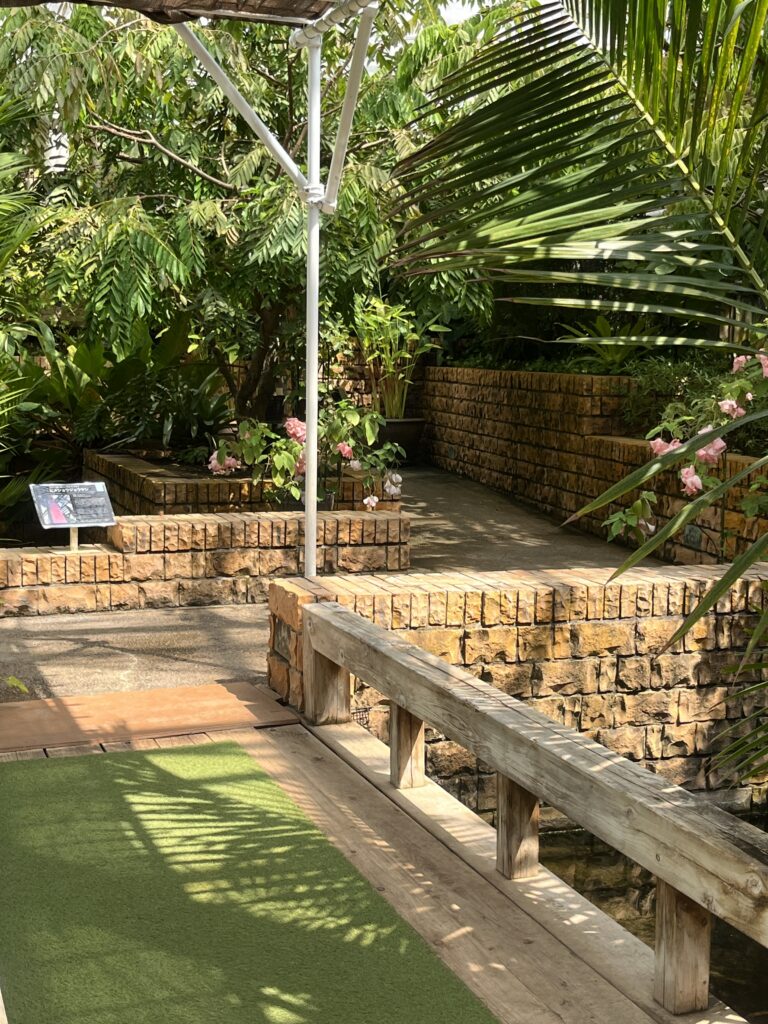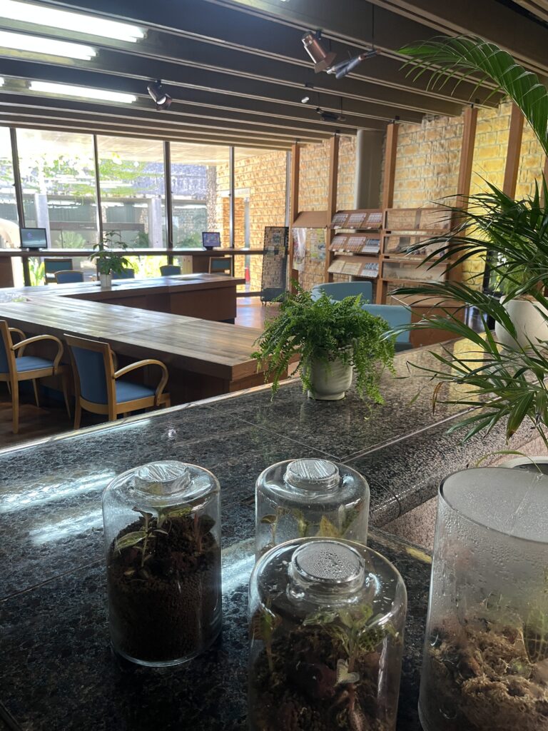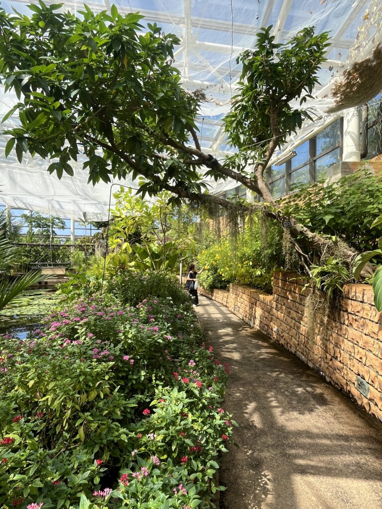 お花が今日は少なすぎますね。お花たちと熱帯ドリームセンターの内装のかっこいい写真です。