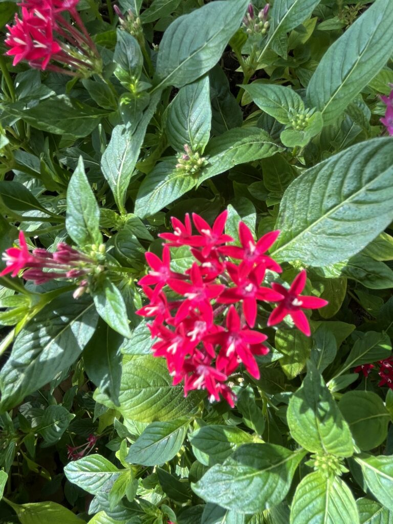 ペンタスは熱帯性の低木で、初夏から秋遅くまで開花します。花は五つの花弁が星型に見える小さな星形の花で、直径は1cm未満の小花が30〜40輪ほど傘状に密集して咲きます。花色は赤、白、ピンク、紫など多彩です。花は半球状にまとまり、全体として華やかな印象を与えます。
